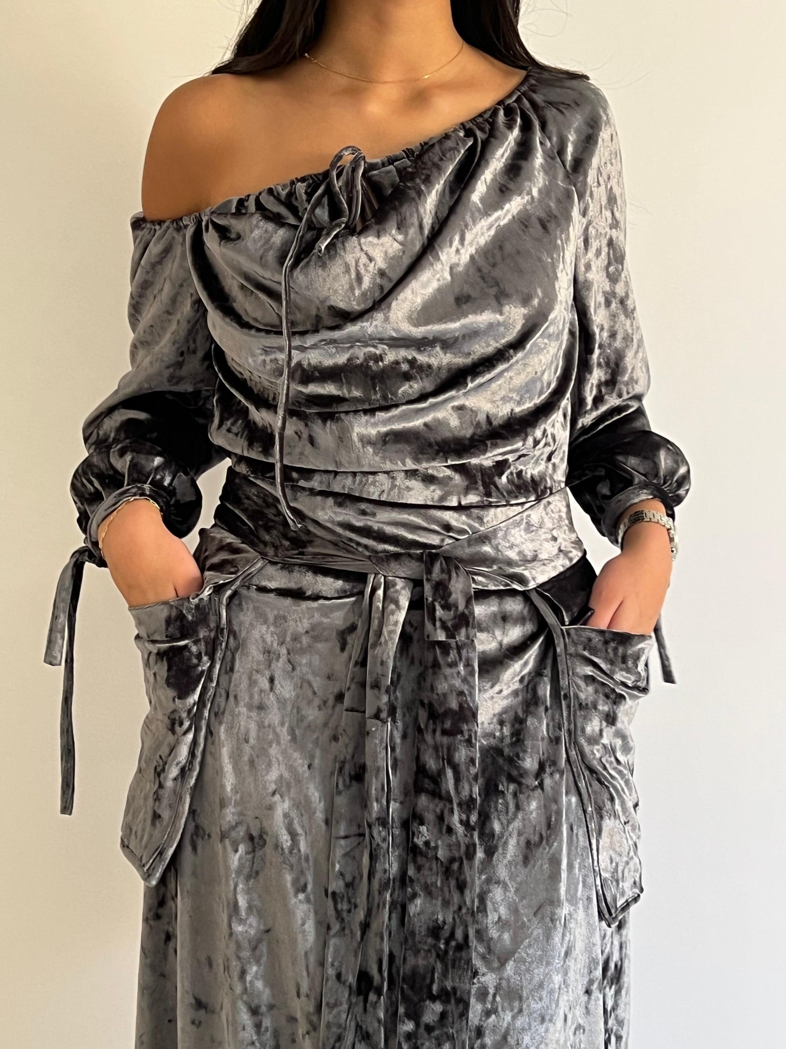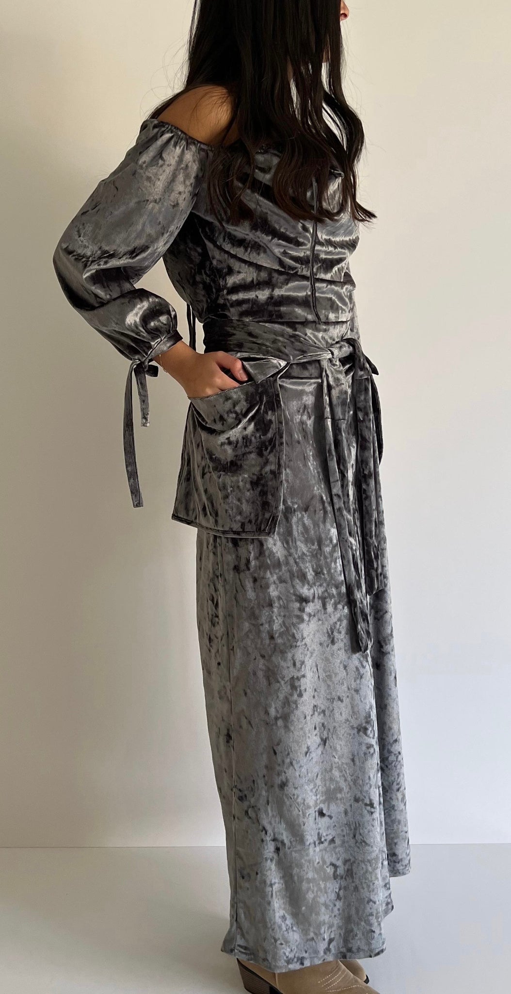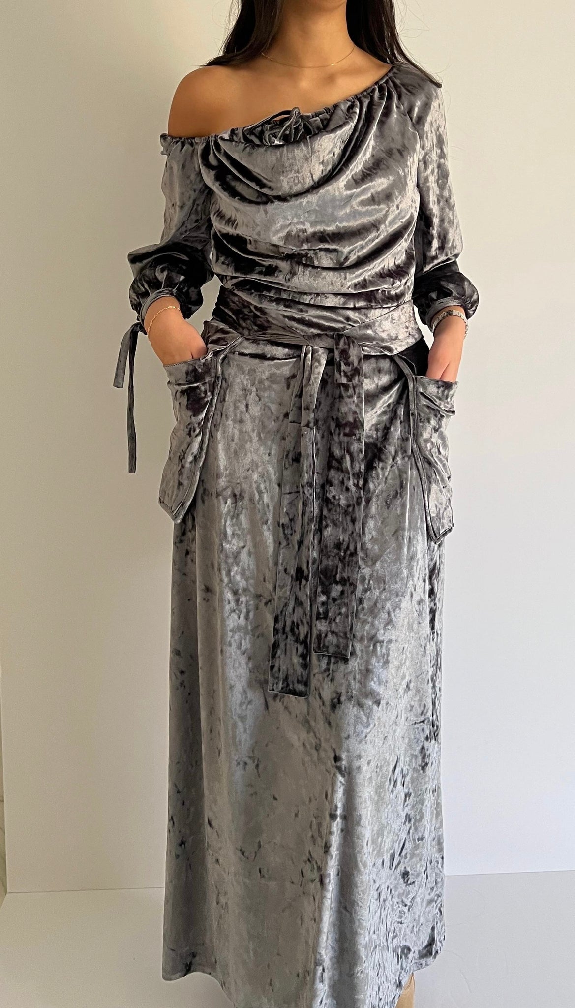 Graphite Grey velvet off-the-shoulder dress with soft draping across the bodice, finished with long sleeves and delicate tie cuffs, a matching velvet belt to define the waist, and discreet side pockets crafted in coordinating velvet.
